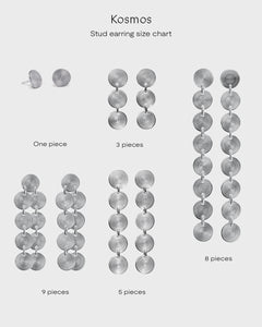 The three-part Kosmos earrings are made of coolly gleaming silver. The three round silver discs connected to each other with small loops are patterned on both sides. Stud fastening on the top disc.