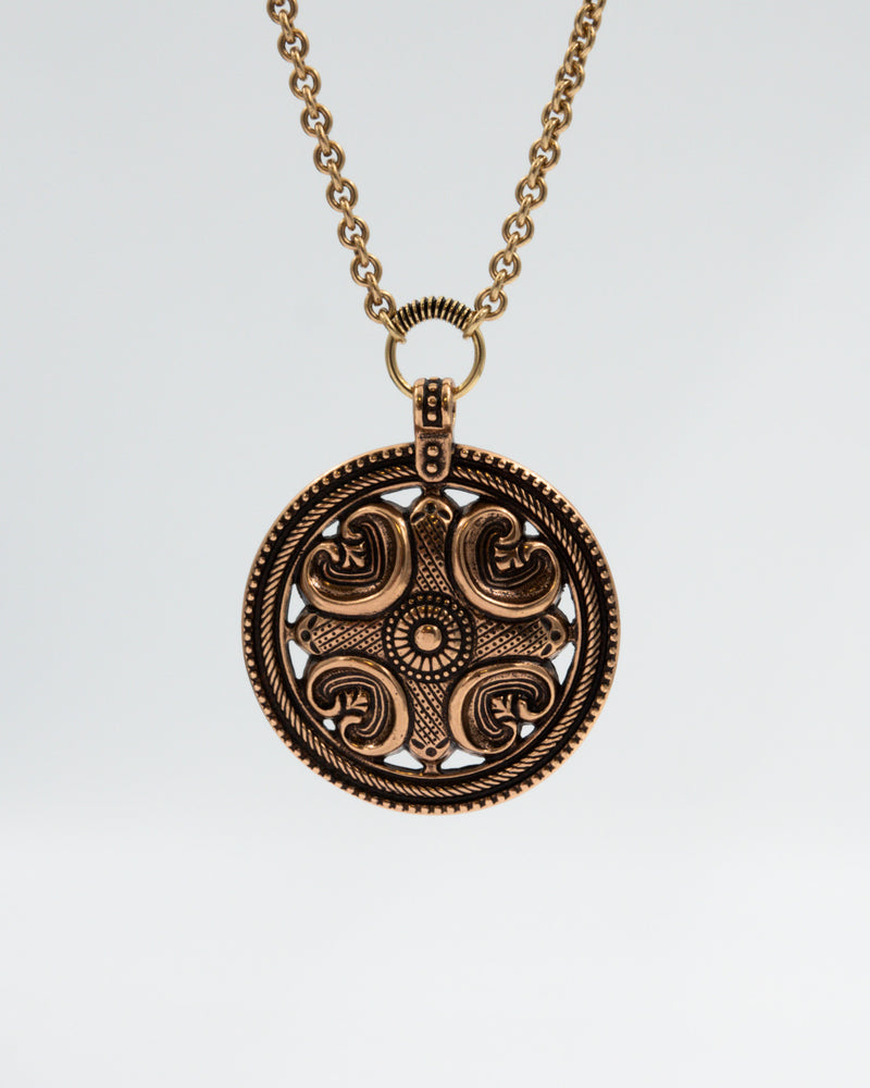 The ornamental patterns of this pendant, the cross and the palmette motifs originating in ancient Greece, were copied from a beautifully crafted silver brooch dating from the 12th century. The pendant was part of the Kalevala jewelry range from the 1930s till the early 2000s. Diameter 46 mm. Anchor chain 70 cm, no clasp.