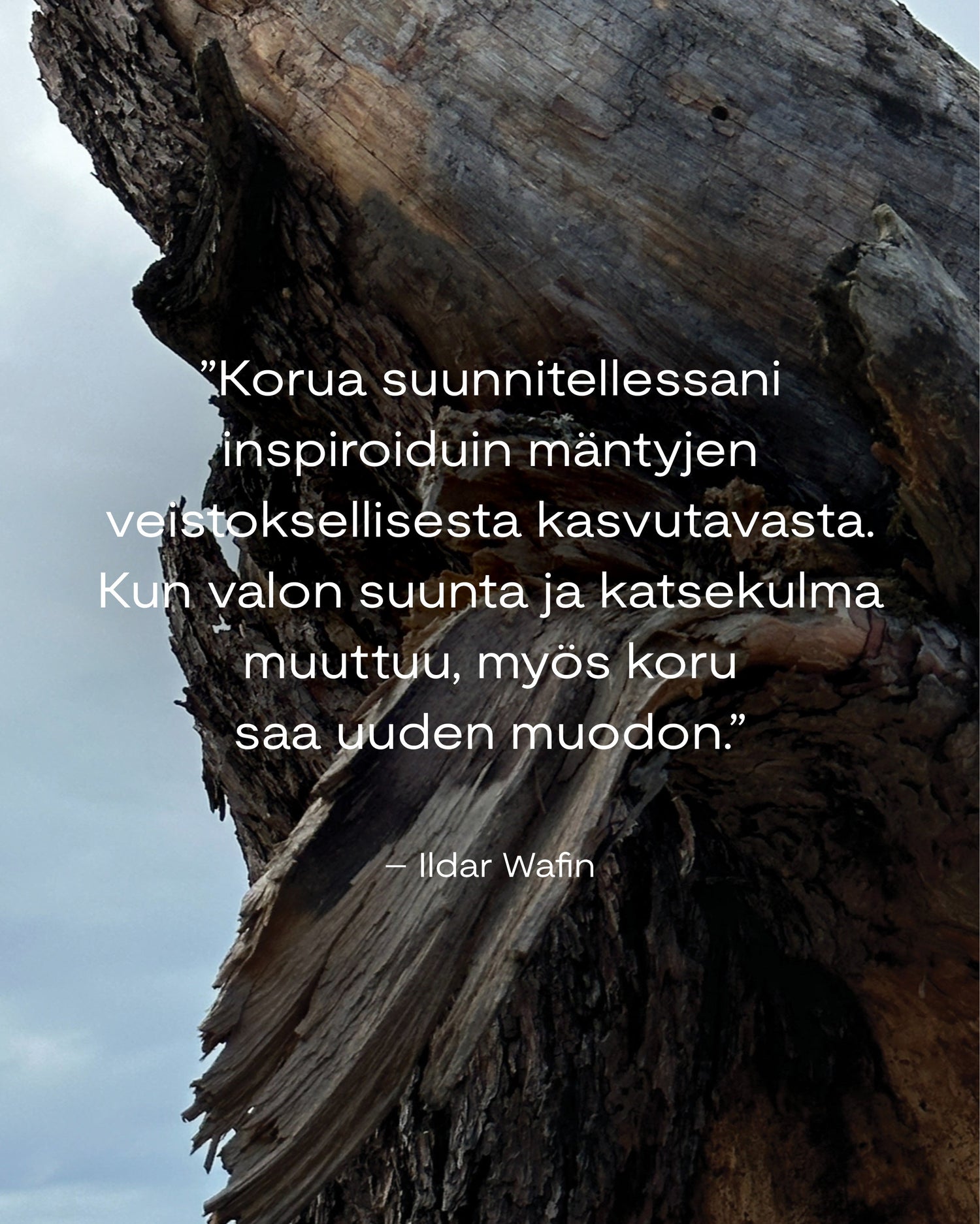"Ajatuksia herättävät muodot ja kuviot vievät minut kiehtovaan maailmaan, jossa luonnon elinvoima ja mystisyys kiteytyvät mäntyihin ja niiden muotoihin." – Ildar Wafin