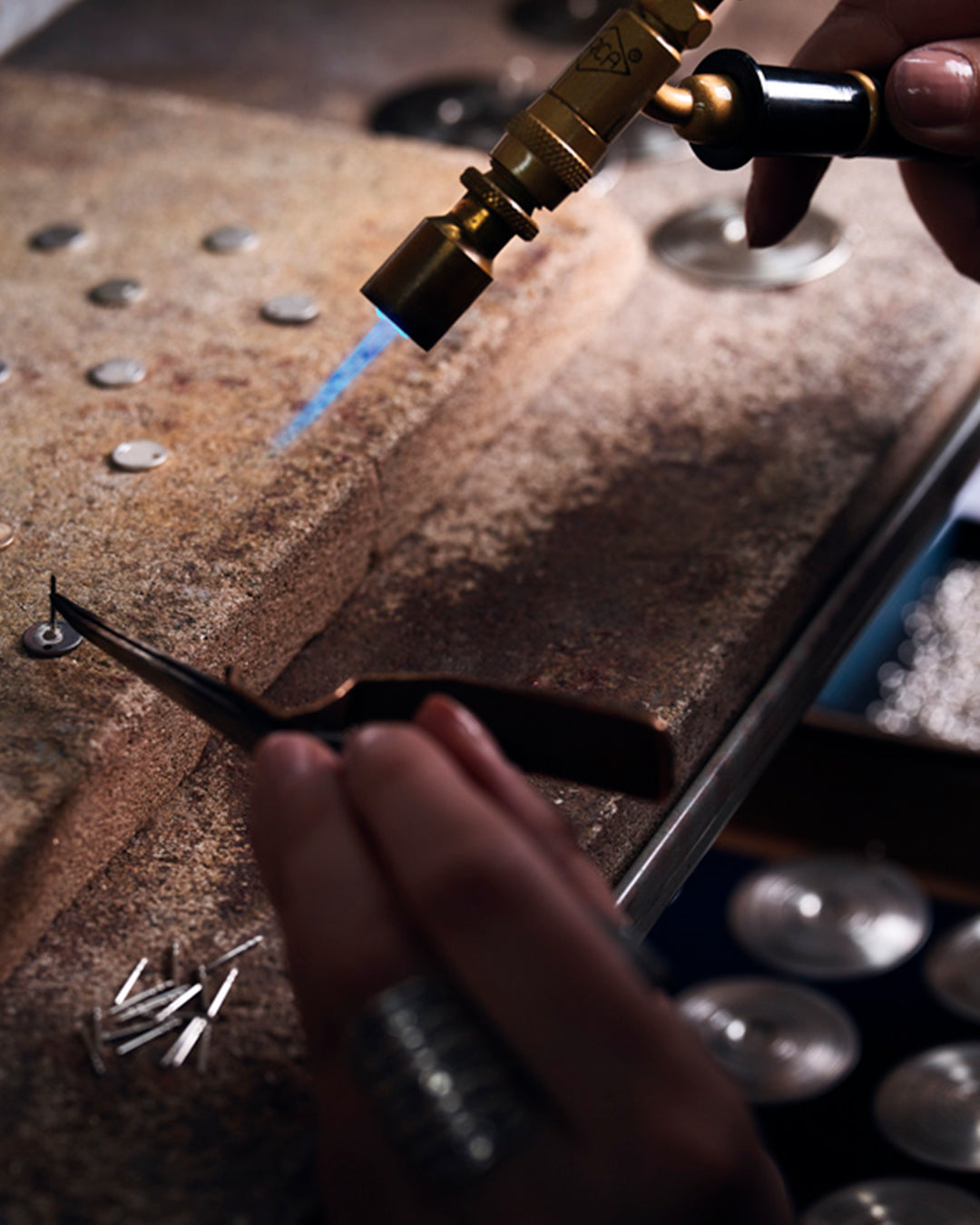”Heittelin poikani kanssa järven rannalla veden pintaa pitkin litteitä kiviä ns. "leipiä". Pomppivien kivien tyynen veden pinnalle loihtimista laajenevista renkaista sain inspiraation Kosmos-koruihin."