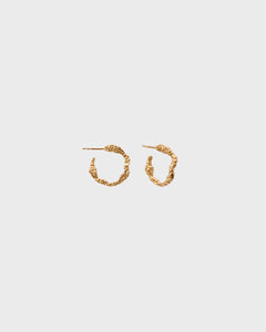 Itu-korvarenkaissa toistuu sarjan koruille tunnusomainen rosoinen, orgaaninen pintastruktuuri. Tappikiinnitys, kullatut taustanastat. Korvarenkaita voi käyttää sellaisinaan, tai niihin voi pujottaa heloja. Korvakorut ovat kullattua hopeaa