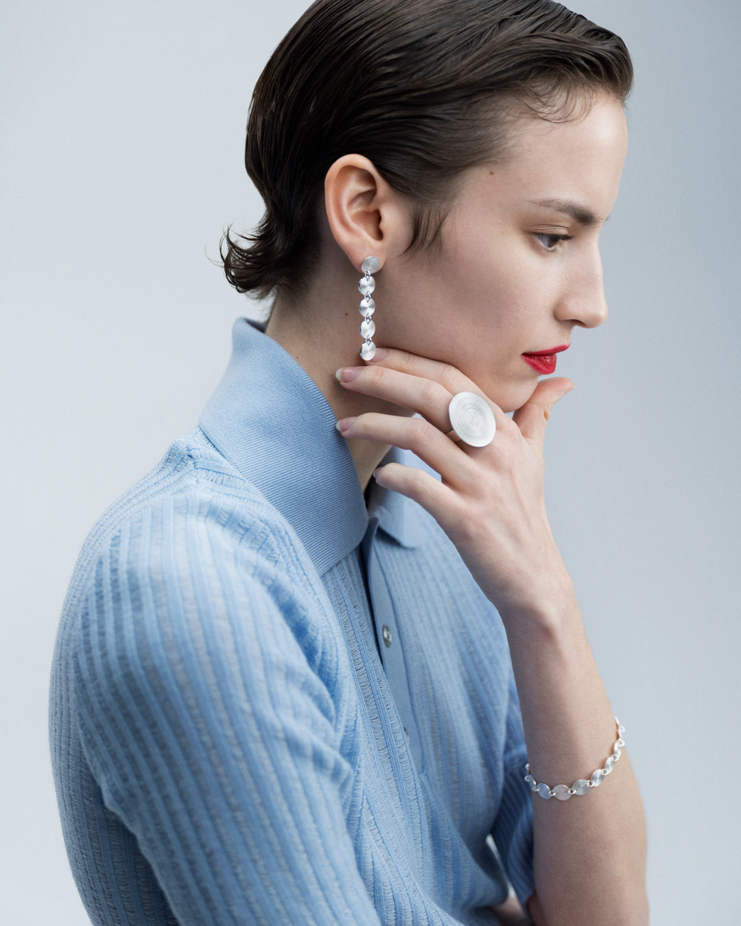 「息子とコテージ近くの湖で石を飛ばす水切り遊びをしていたある日。その時見た、静かな水面の上を飛ぶ石が残した波紋の輪の広がりに、コスモス・ジュエリーのイメージを見つけました。」