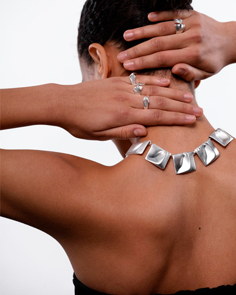シルバージュエリーをデザインする際のウェクストロムの目標は、フィンランドの雪に覆われた冬の風景と凍った湖を描くことでした。それは、光沢のあるシルバーとマットなシルバーをドラマチックに組み合わせた、ジュエリーのユニークな仕上げに見ることができます。また、アクリルなどの意外な素材も、偏見なく大胆にジュエリーに組み合わせています。