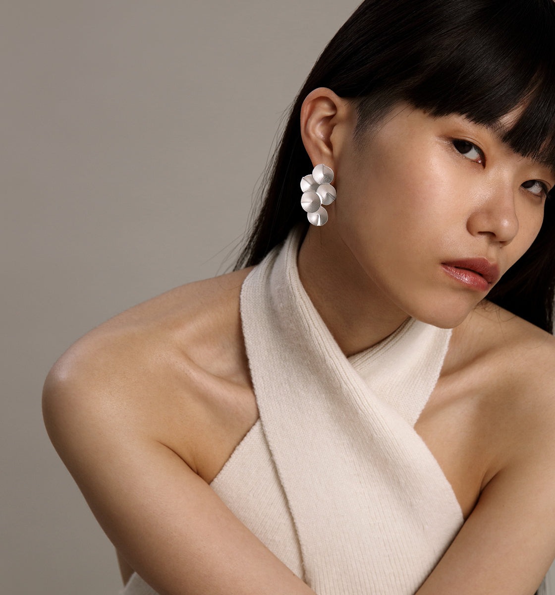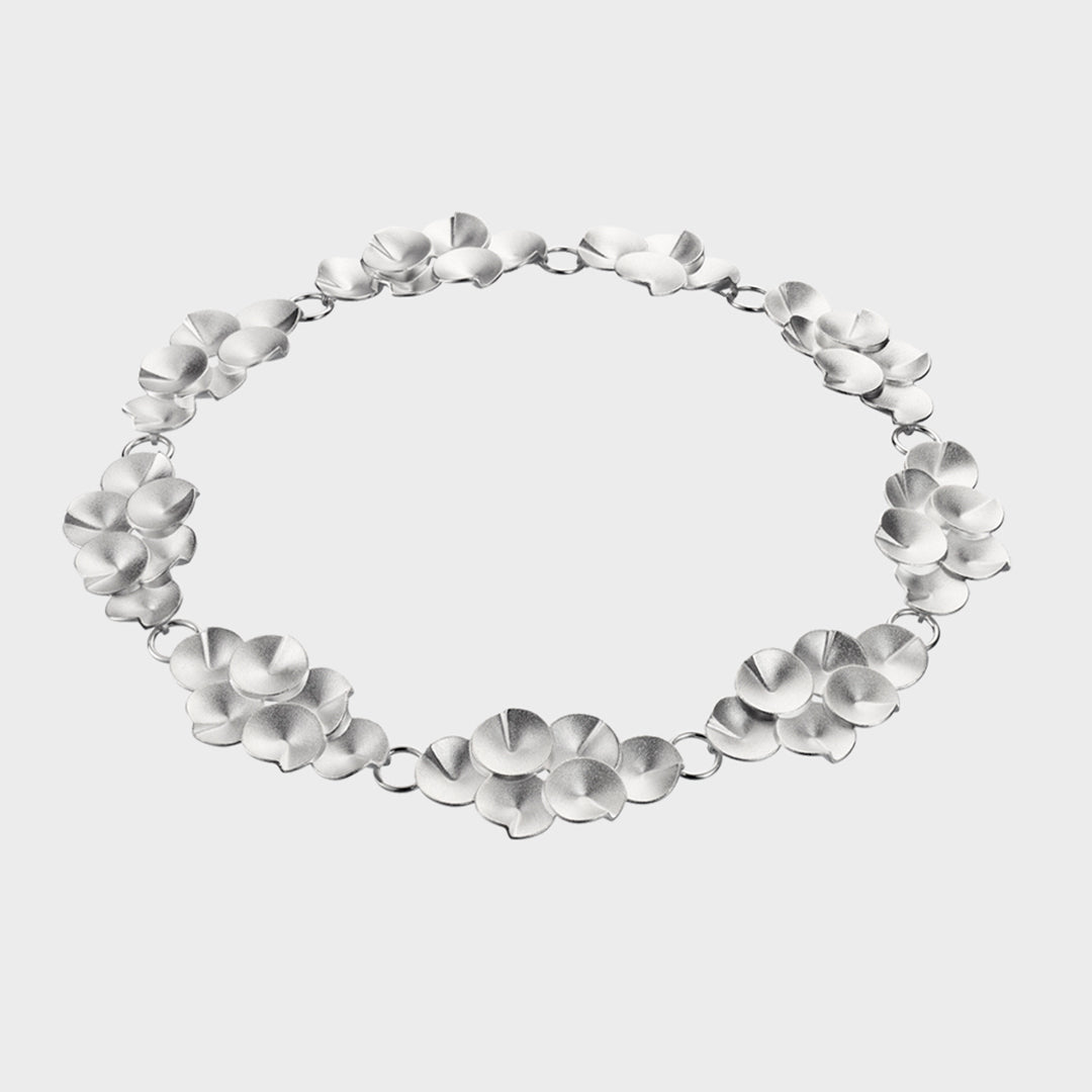 Toisiinsa kartiomaiset yhdistyvät hopeaelementit ja niiden mattapintojen himmeä hehku tekevät Kaikuja-kaulakorusta todellisen katseenvangitsijan.