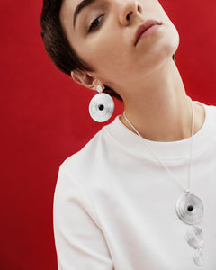 Kosmos(コスモス)シルバーペンダント オニキス:柔らかな輝きを放つシルバーと、黒いオニキスの石との組み合わせが印象的なペンダントです。静かな水面に石が残した波紋の広がりから着想を得たデザインは、その名のとおり宇宙の果てしなさを彷彿とさせます。
