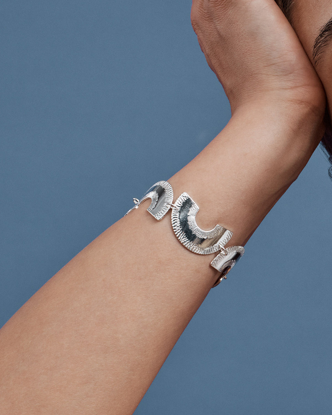 Männytブレスレットは存在感があり、彫刻のようなデザインでありながら、軽やかに着用できます。その形状は有機的で柔らかな波のように流れ、光沢のあるシルバーベースに小さな粗いディテールがコントラストを生み出しています。サイズは直径がそれぞれ5.4cm/5.7cm/6.0cm/6.4cmの4サイズあります。着脱時にブレスレットを無理に曲げないようご注意ください。