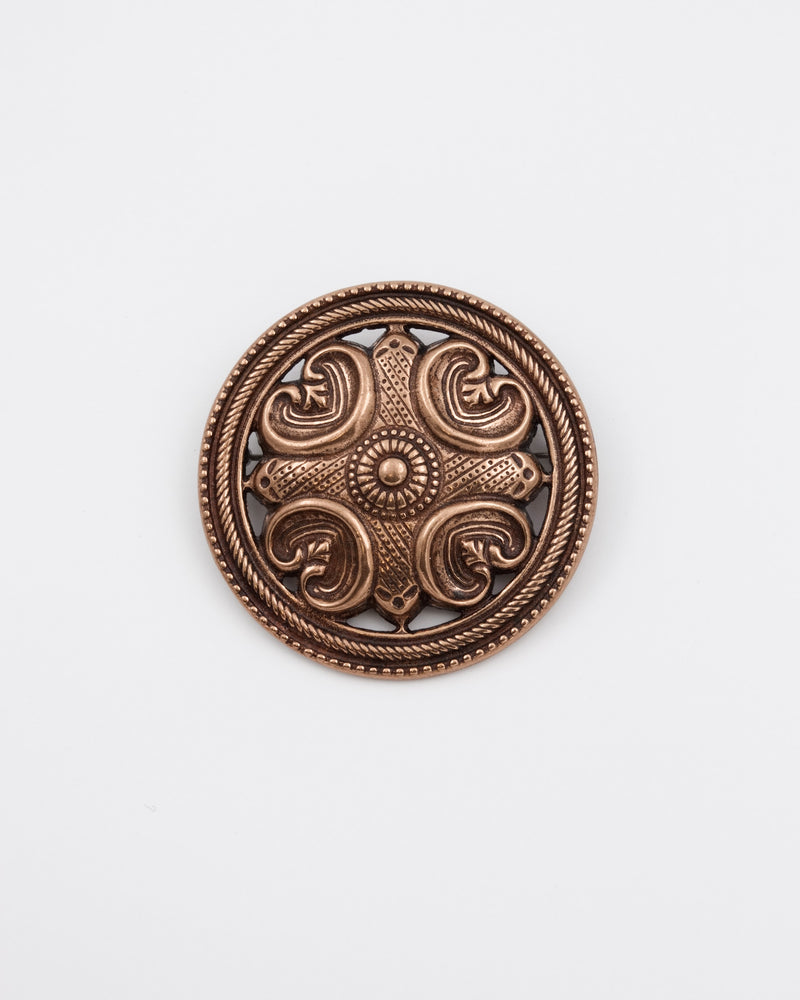 このブローチの装飾模様である十字とパルメットのモチーフは、古代ギリシャに起源を持ち、12世紀の美しく作られたシルバーのブローチから複製されたものです。このブローチは、1930年代から2000年代初頭までカレワラのジュエリーコレクションの一部でした。直径46mm。ブロンズ製、ステンレススチールピン付き。